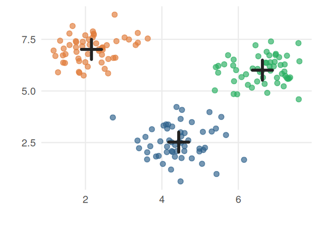 Klasteranalüüs — k-keskmiste meetodil leitud kolm rühma hajuvusdiagrammil