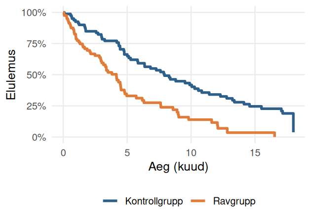 Kaplan-Meieri kõver — kahe grupi elulemus aja jooksul